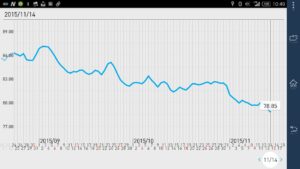 11月4日、ダイエット開始からちょうど10kgの減量に成功した事を切っ掛けに、八ヶ岳WiL稿房「第3の柱」として配信開始を宣言した『ダイエット日記』ではあるが、なかなか二の矢を継げないでいた。そもそも、最終目標である15kg減量(to 75kg)まで、どんなペースで体重を減らしていけるかがわからない。旧『銀行業界鳥瞰図』のように銀行業界のマクロ統計に合わせて配信するといったようなリズムが掴めないのだ。とは言っても、第1号配信から今日でちょうど10日目。さすがに、その後の経過報告をしないのはまずいだろう。今朝の測定結果までを含む体重推移グラフを下に示そう。