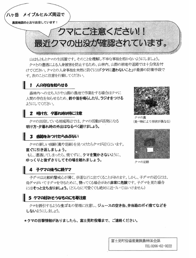 第3報は、昨日(17日)の朝、私の外出中にポストに投函されていた。富士見町役場による「注意喚起」のチラシだった。人身事故を未然に防ぐためには「クマに遭わない事」が最善の防衛手段であるとした上で「5つの注意事項」が明記されていた。裏面は地図で、クマの目撃場所とその日時が示してある。「なんて簡潔明瞭で手際がよいのだろう。」—ちょっと感心してしまった。内容的にも勉強になったので、チラシ表面を以下に掲載する。