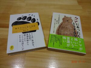 そして、第3報を受けて、弊社は「対クマさん非常事態宣言」を発し、第3種警戒モードに移行した。クマさんとの『新たな戦いの序曲』の幕開けである。「危機対応」で最も大切なのは「迅速性」だ。既に、第1報の直後に、私と家内(社主)用の「カラビナ付きクマ除けベル」をAmazonで購入。第2報後には、さらに、クマ除けホイッスルが付いたクリップ型(ベルト通しがなくても装着可能)ベルを2個追加発注した。また、敵(クマさん)の事を学ぶために関連書籍も2冊購入。