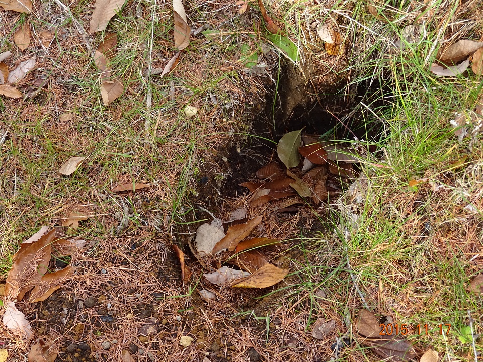 届いたグッズに盛り上がった後、ちょっと冷静になった。改めて、敷地内にクマさんの痕跡がないか確かめてみよう。600坪ある敷地内を丹念に歩き回ったのだが、落ち葉と芝生で足跡は確認のしようがなかった。鹿の糞はあちこちで発見できたが、クマさんらしいものはない。諦めて、枕木テラスとメイン・ウッドデッキに挟まれたスペースに戻ってくると、花梨の木の根元近くに見慣れぬ穴が… 深さは30cm位はあるだろうか? これって、誰の仕業だ~