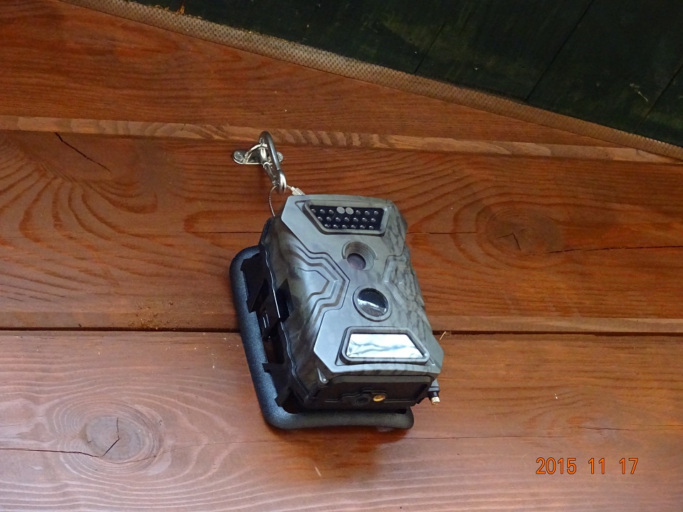 熊除けベルと書籍購入で終わったのでは、弊社(私)のこだわりは満たせない。そう言えば、動物の夜間活動を観察するために「暗視装置付き自動撮影ビデオ」を購入したものの、まだ使っていなかったな。八ヶ岳本宅の書斎に置いてあったっけ… サンコー製の「MPSC-26」の未開封の箱はすぐに見つかった。こんな趣味のグッズを在庫として保有しているのが、弊社の強みである! 細かい機器設定を終えた後、オフィスの壁に設置した。勿論、14日のクマさん移動経路をバッチリと捉える事が出来る位置である。