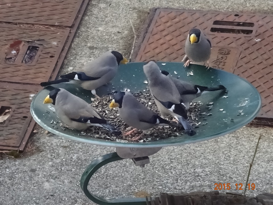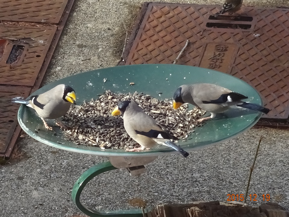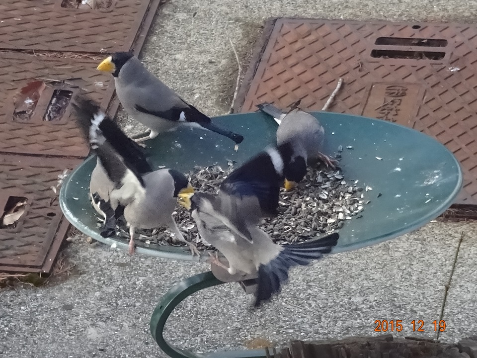 今日は、10時40分頃、ちょっと遅めの「給餌」となった。本宅で所用を済ませ5分位してオフィスに戻る。オフィスの窓から、給餌台を見下ろすと、もう第1号のお客さんが食事中だった。上得意客である「イカル」さんだ。このお客さん、某国の観光客のように群れをなして到来し、無償のヒマワリの種を「バク食い」して行く。