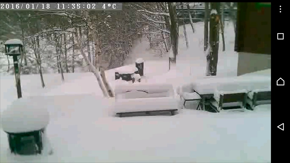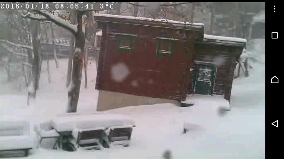 昨晩就寝したのは午前1時半過ぎ、今朝目覚めたのは7時半ちょっと前だった。軽い朝食を済ませてから、書斎に向かう。リビングで見た朝のニュースで、各地で交通が大混乱、中央道は上野原ICから先の下り方面が「通行止め」ある事は確認済みである。「八ヶ岳オフィスの状況はどんなだろう?」と不安に感じ、デスクトップPCで5台設置してあるビューカメラをチェック。5台の内、枕木テラスを映し出すカメラは、遠隔操作で視野をコントロールできるようになっている。そのカメラで枕木テラスとファイヤープレイス(下掲上)、そしてオフィスのエントランス周辺(下掲下)を撮影。ご覧の通り、昨日までの「異様な暖冬・雪無し」状態から一変、オフィス周辺は「積雪20cm」といった感じだろうか…