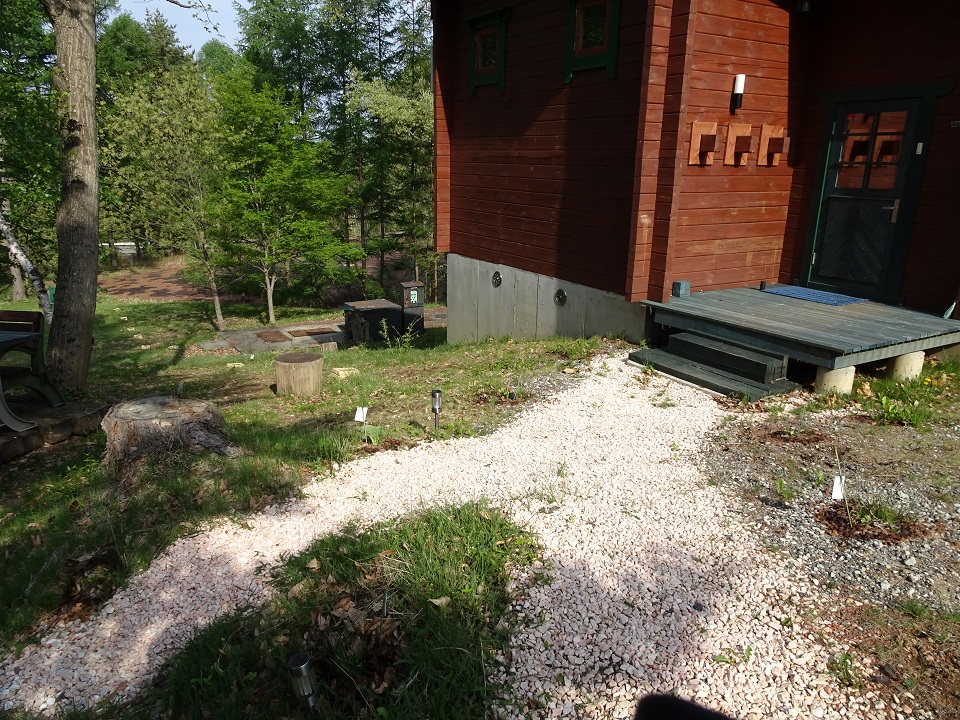 だが、鹿さん達との闘いは、冬期の樹木保護だけではない。むしろ難しいのは、春から秋にかけての花卉類の保護である。オフィスセルフビルドを終えた後、私は、従来からあった枕木アプローチからオフィス・エントランスのウッドデッキまでのスペースには、明るいトーン(ややピンク掛かった)のガーデンストーンを敷き詰めて、誘導路を作る事にした。さて、その周辺には何を植えようか?真っ先に思い付いたのが、ホスタ(ギボウシ)だった。