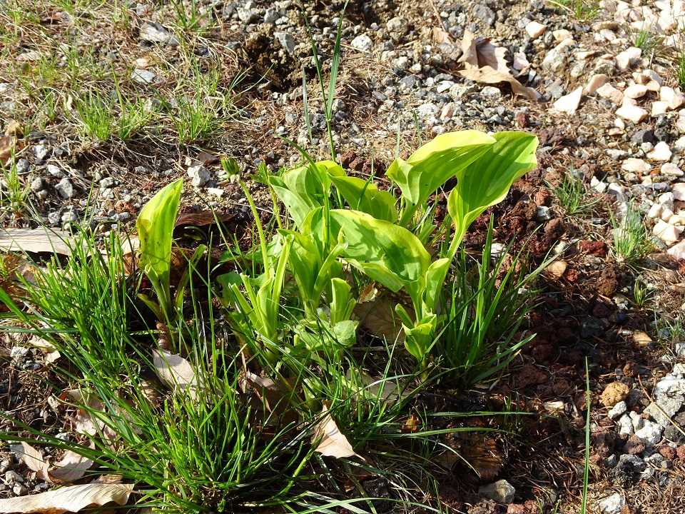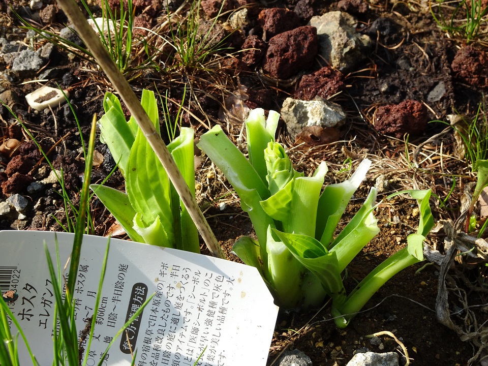 が、植え付けの翌日に川崎自宅に帰り、その1週間程後にオフィスに出社すると、すべてのホスタの葉が見事に食い荒らされていた。一目見て、鹿さん達の所業とわかる無残な様だった。夏の終わりの時期に葉をむしられてしまったのでは、もうホスタは全滅だな… 諦めて、無策のまま秋を過ごし、過酷な冬を耐えた。