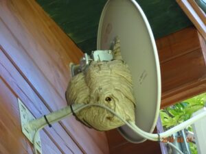 講演の合間を利用して、8月1日と2日に八ヶ岳オフィスに滞在した。ウッドデッキの部材を注文するための細かい採寸作業等がメインの滞在目的であったのだが、作業中にオフィスの壁に敷設したBSアンテナの裏に、スズメバチが大きな巣を作っているのを発見したのだ。