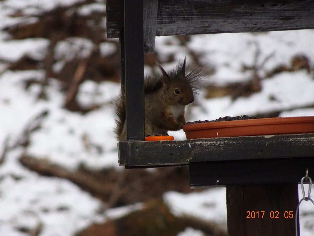 そう言えば、トリグラフ・リサーチ直営レストランに給餌していなかった… 屋根付きの1号店と2号店に、ひまわりの種と半切りにしたミカンをどっさりと置く。10分も要せずに、メインウッドデッキ隅に置いた1号店には、お馴染みのリス君がやって来た。懸命にひまわりの種を頬張る姿に、彼の生命力を感じた。