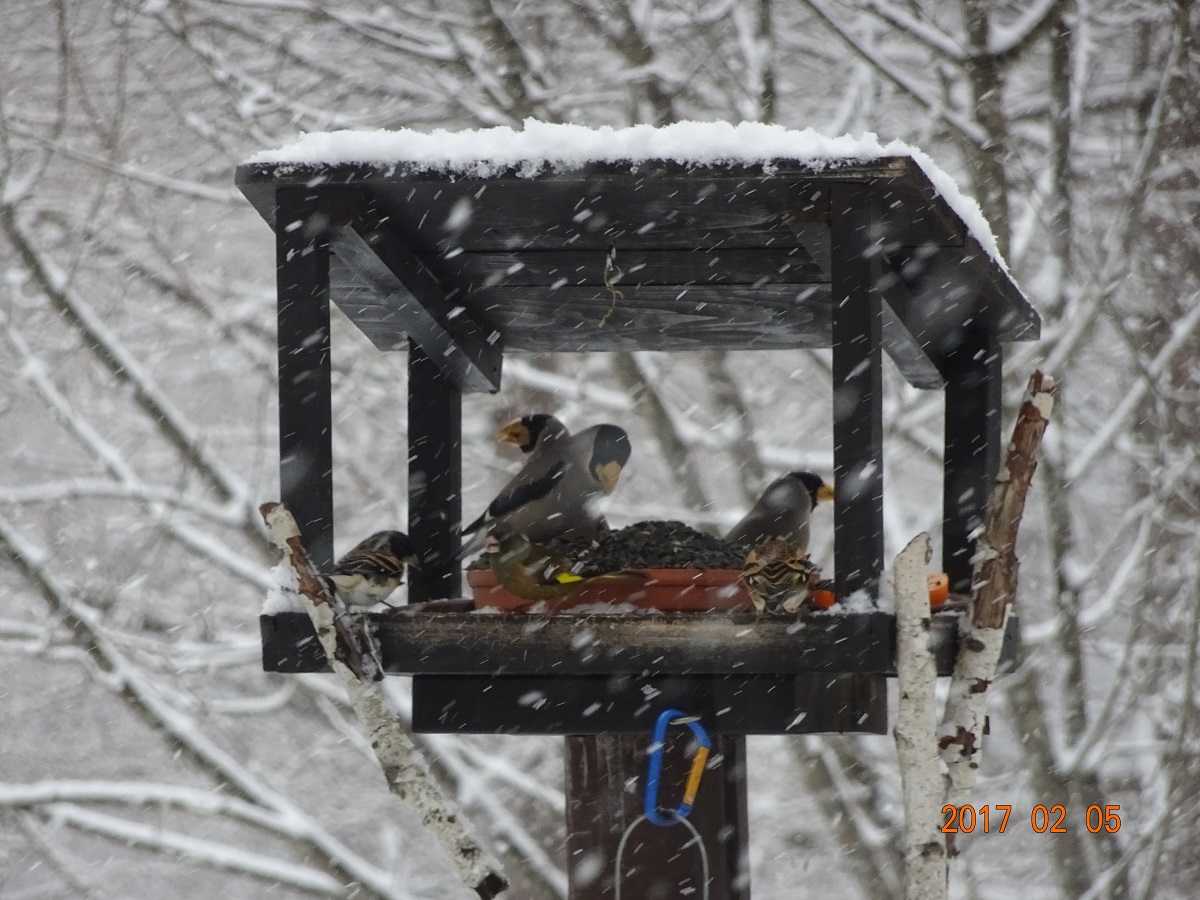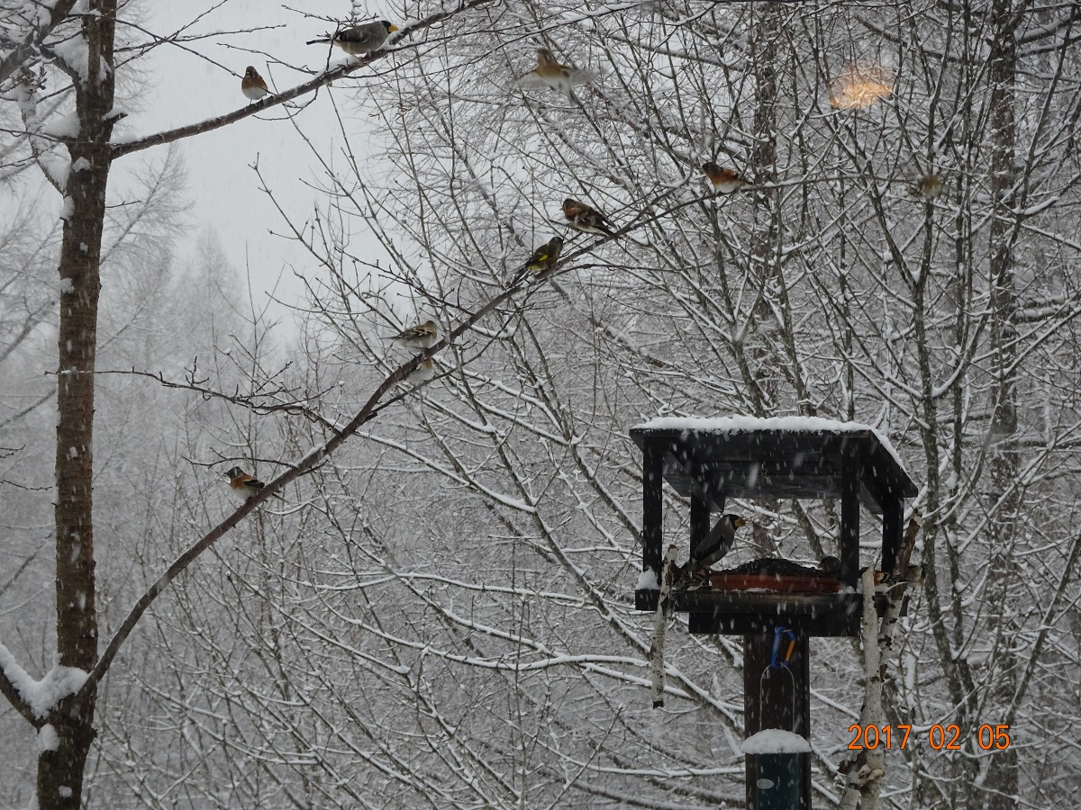 その後、本宅に入って30分程、雑誌を読む。ふと窓の外を眺めたら雪が本降りになっていた。さらに驚いたのだが、枕木テラスに設置した2号店に野鳥さん達が殺到しているではないか。脇の桜の木には、順番待ちの野鳥さんが並んでいる。