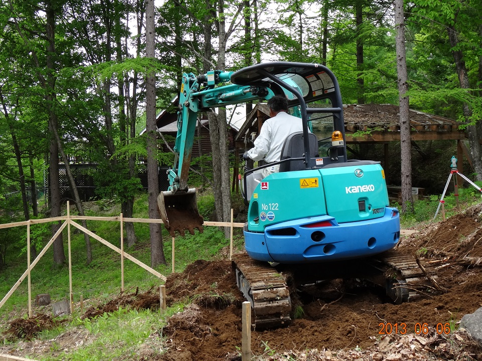 基礎工事前に伐採した広葉樹や松の根の掘り起こし・処分作業が中心だが、ユンボのパワフルな動きと現場監督さんの巧みな操作に感動。男の子は「働く車」大好きなのだ!