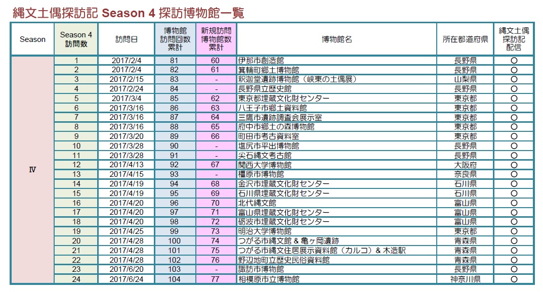 Season 1からの累計博物館訪問回数は104回、探訪した博物館数は77館に達した。「伊達と酔狂」で始めた土偶さん探訪の旅も、ここまで徹底すると、とっくに「趣味や遊びの領域」を超越している。