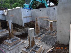 2013年7月10日、オフィス基礎工事もこの日を含めて残すところ2日となった。朝から独立基礎工事の後半戦が始まり、11本のボイド管に生コンが注がれていった。