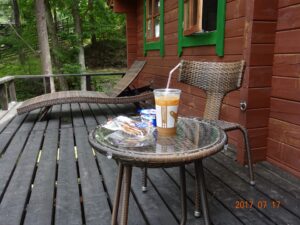 ローソンでの買い物も済ませ、オフィスに戻ったのは8時40分過ぎ。オフィスウッドデッキに置いたガーデンテーブルに腰掛けて、庭を眺めながら「定番朝食メニュー」を食す。
