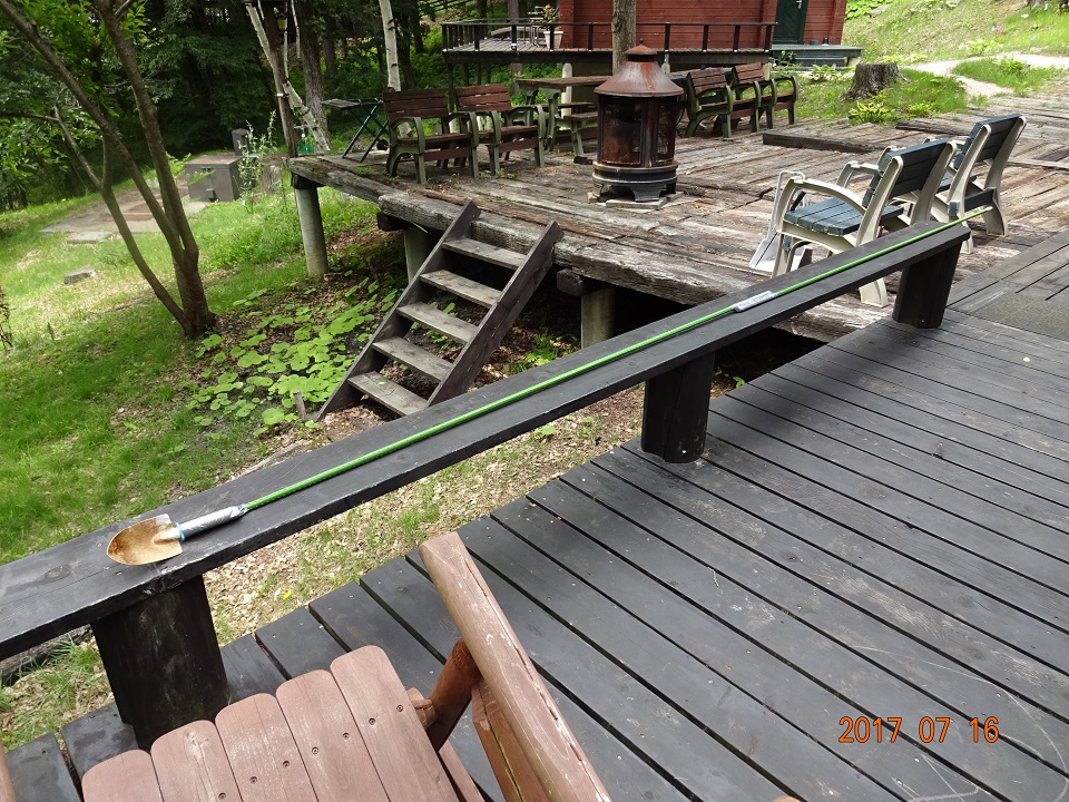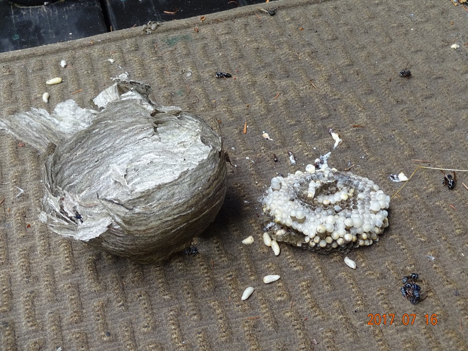 ふと、枕木テラスの上に、昨日、自分で駆除した「クロスズメバチ」の巣の残骸が残っている事に気が付き、ついでだからテラスの掃き掃除をする。