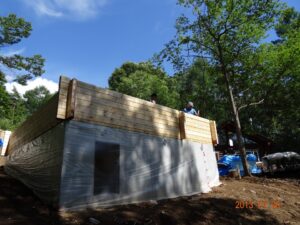 2013年7月20日土曜日。Tさんと次男が助っ人として復帰。朝からログ壁の積み上げ(立ち上げ)作業を再開。