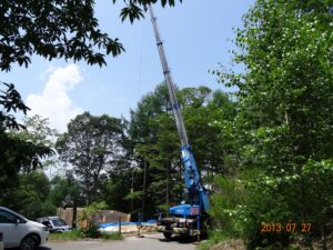 2013年7月27日午前7時40分、八ヶ岳本宅の敷地前の町道に、レンタルした大型クレーン車が横付けした。以降、午後5時半まで続く、長い戦いの日が幕を開けた。