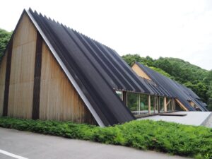 安藤百福センターの建物そのものが、隈研吾氏設計による正に「アート」であり、周囲の自然環境に見事に溶け込んでいる。様々な角度から眺めて、その造形美を堪能できるのだ!