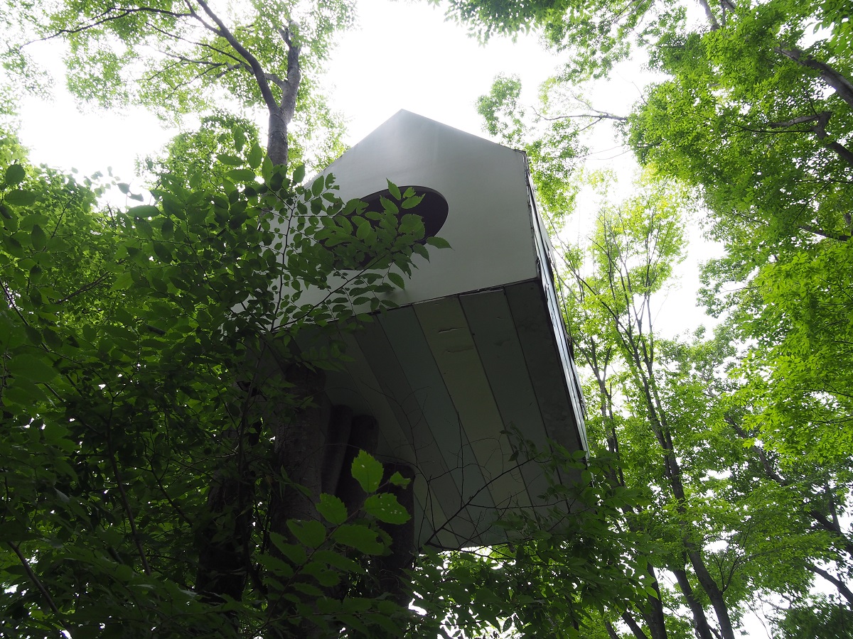 底面には入り口がないので、人間は梯子を掛けて、この大きな巣箱の穴から出入りするのであろう。人間が野鳥になった雰囲気を味わうためのツリーハウスだとしたらシンプルでわかりやすいコンセプトだ。