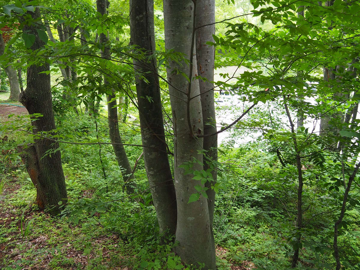 仕方ないので支柱となっている樹木の「樹種判定」を試みた。灰白色の樹皮、楕円形に互生する葉等々の特徴から「橅(ブナ)」系であろう。