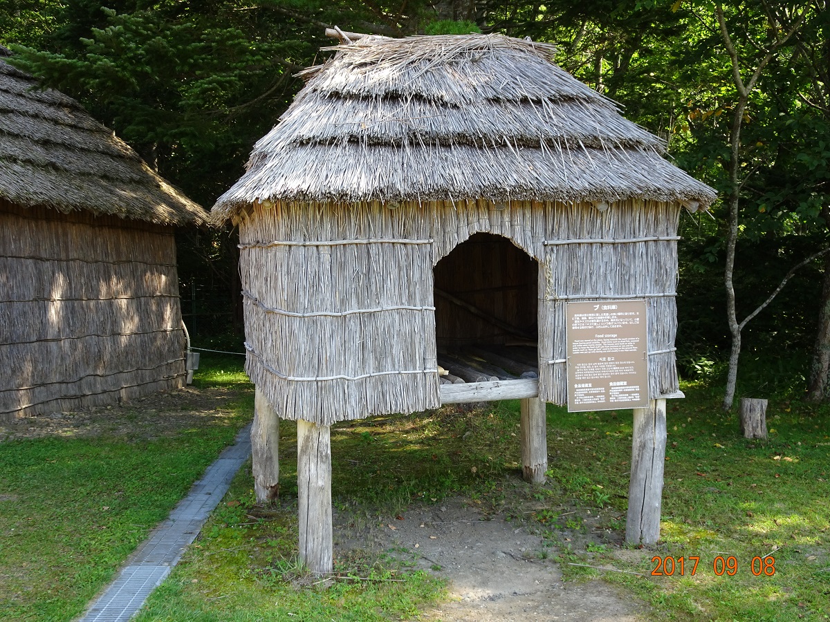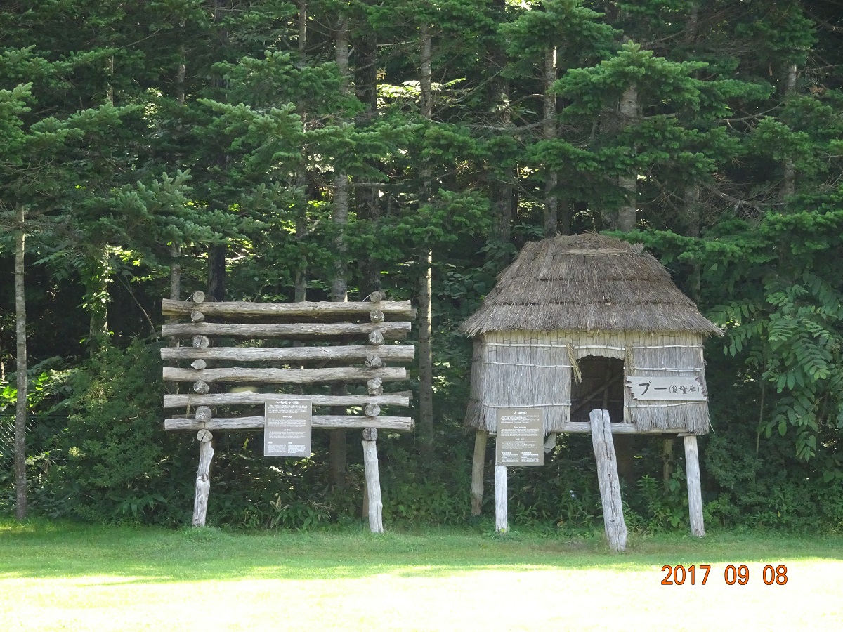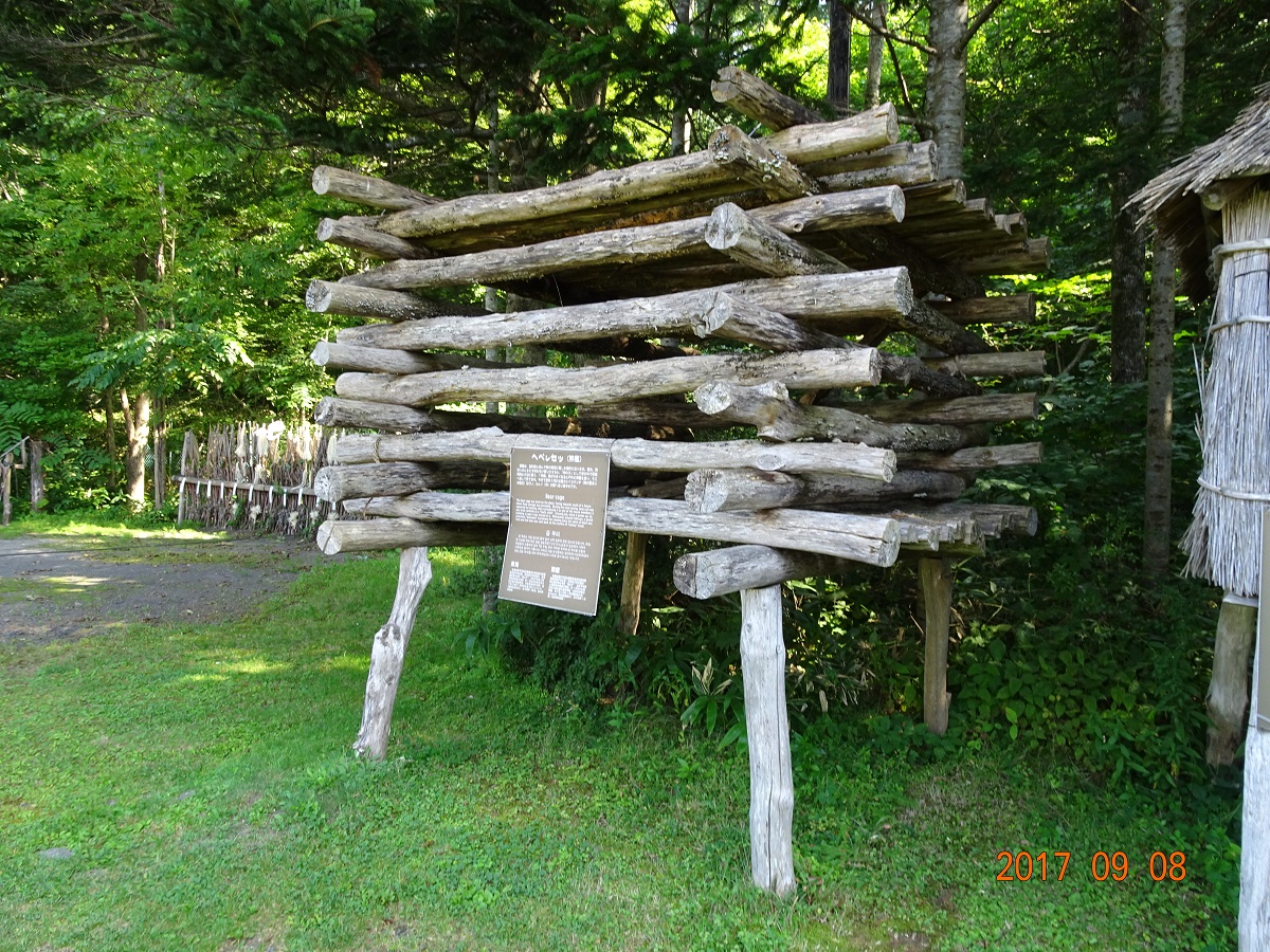 だが、旅行3日目(9月8日)に「白老ポロトコタン アイヌ民族博物館」を訪れた際に、ちょっと心惹かれる構造物に偶然出会ってしまったのだ。敷地内に建てられていた「プ(食料庫)」と「ヘペレセツ(熊檻)」である。遠目に見た時は、「ん? 低い位置にあるツリーハウスか?」と思った。