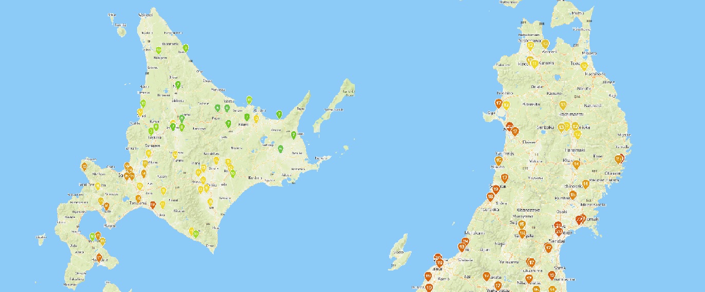 北海道や東北と比べたらどうかなと思って、それぞれのエリアのマップを表示してみた。やっぱり北海道は寒い。北部には、既に気温10℃以下のstationがゴロゴロある。役員慰安旅行で訪れたばかりの札幌は? オイオイ、14~15℃で八ヶ岳より暖かいじゃないか…あっ、富良野がちょうど同じ位の気温だ。お花畑周辺は確かに八ヶ岳と似たような気候だったな。函館は17℃とやっぱり暖かいなぁ。