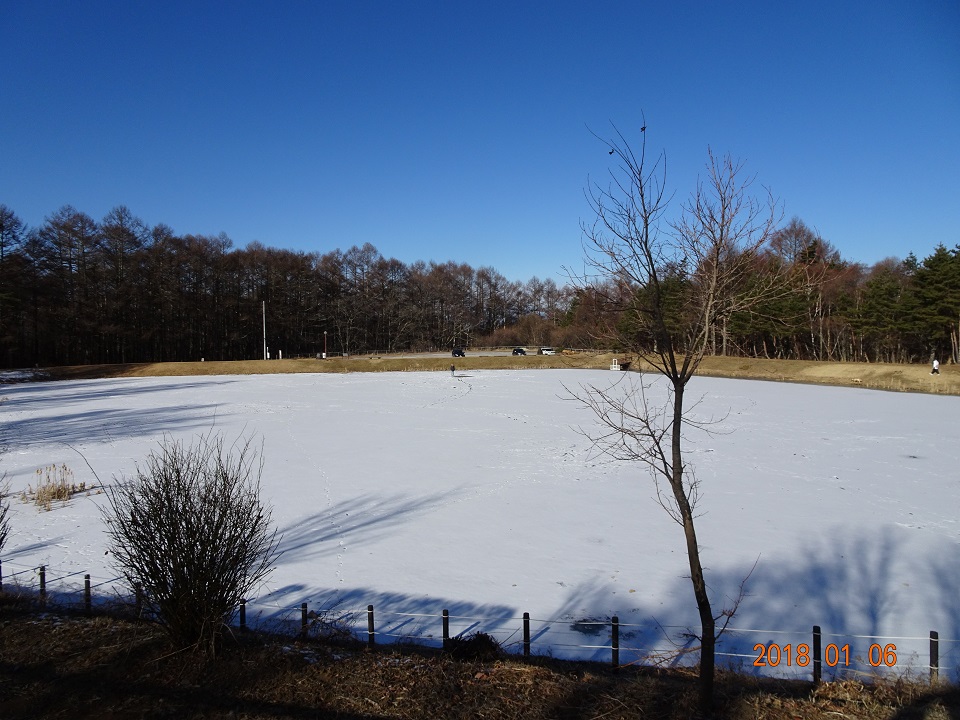 写真を撮影した後、北アルプスや南アルプスの撮影スポットに移動したが、何故か山々は雲に覆われていたので写真撮影は諦めた。その後、公園内の散歩を本格的に開始。園内の「まるやち湖」は湖面が完全に凍っている。