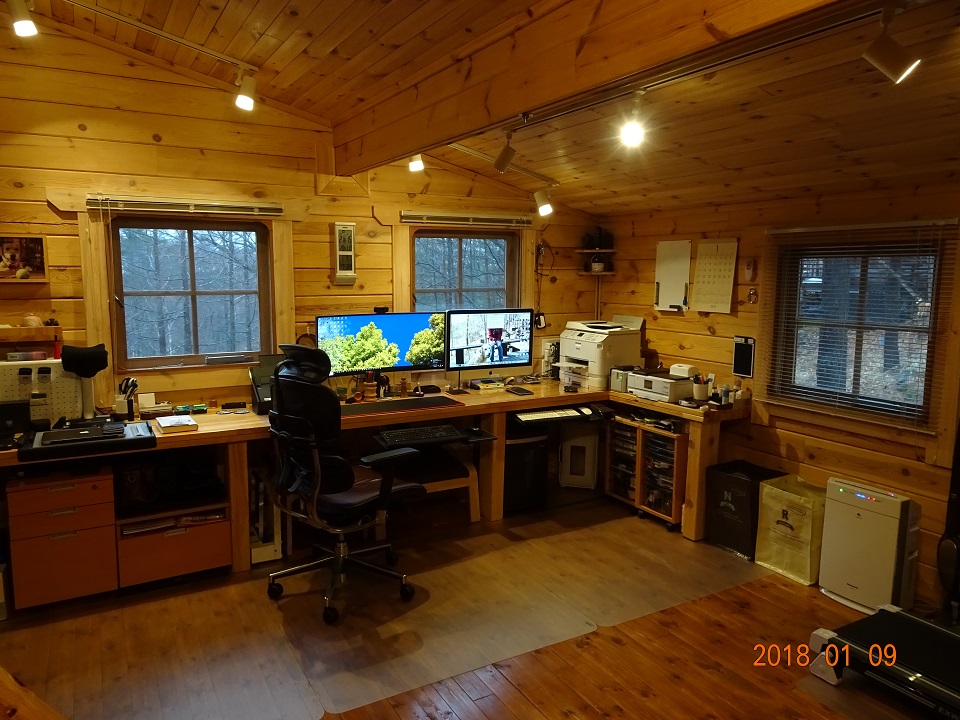 今日は特別に、オフィス・セルフビルドの「真の完工期」から4年を経過した我がオフィスの内部を4枚の写真で紹介したいと思う。ここが、弊社(トリグラフ・リサーチ)の『知的生産の基地』なのだ!