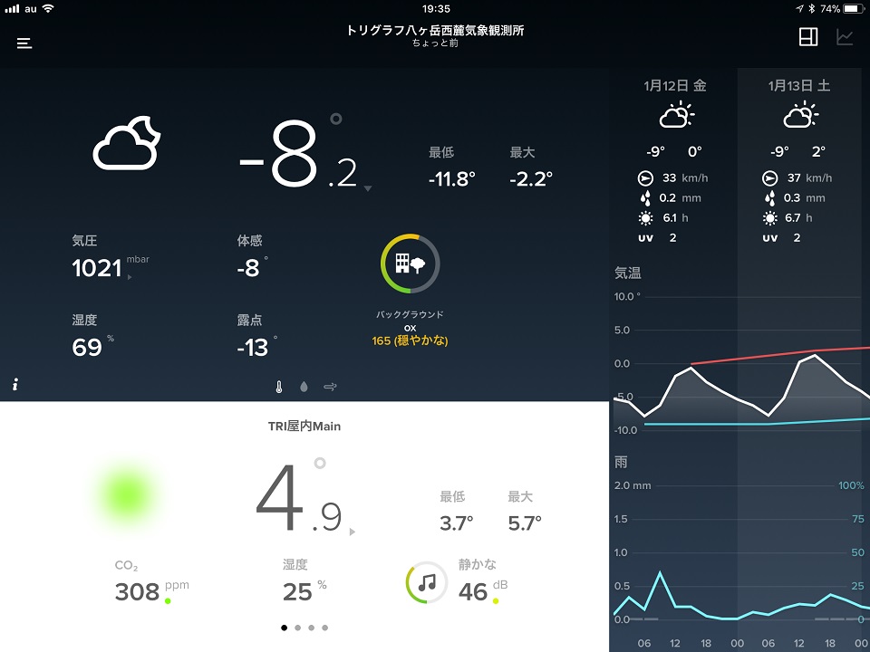 次に、トリグラフ八ヶ岳西麓気象観測所のデータにアクセスする。外気温はマイナス8.2℃まで既に低下。外気温推移グラフを確認すると、今日の早朝にはマイナス11.8℃まで低下していた事に気が付く。明日の朝もマイナス10℃以下に低下するのは確実である。雪は少ないが、やはり八ヶ岳オフィス周辺の自然環境は過酷なのだ。