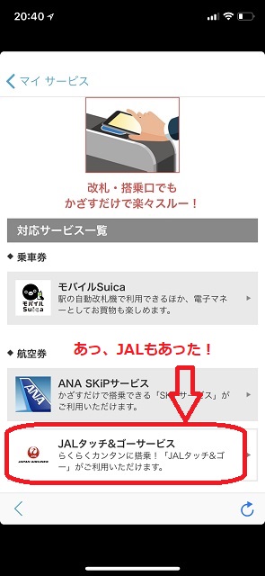 「かざすフォルダ」には、他にどんな隠れ機能があるんだろう? 気になって改めてチェックすると、モバイルスタバのサービスが含まれていた「電子マネー」の左隣に「乗車券・航空券」というメニューがあった。開いてみたら、モバイルSuica、ANA skipサービスの下に「JALタッチ&ゴーサービス」とあるではないか(゚o゚;