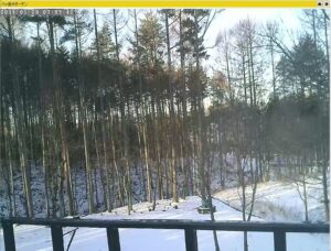 続いて「オフィスのデスクから庭を眺める目線に設置」したカメラの映像をチェックした。ちょうど財産区林の樹間から庭に朝陽がさし始めるタイミングだった。どうやら今日も快晴のようだ。