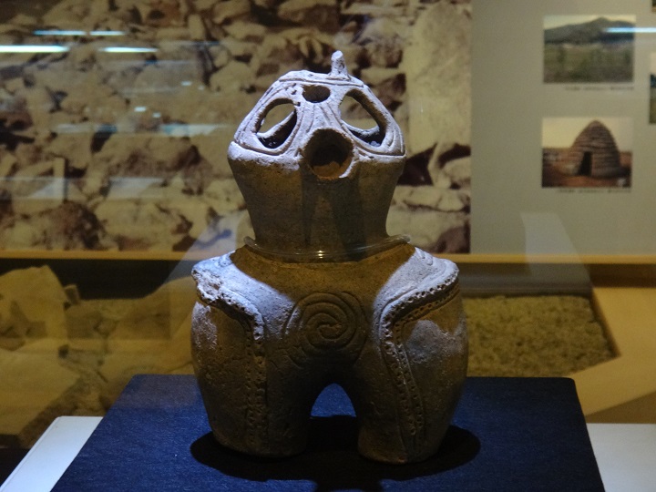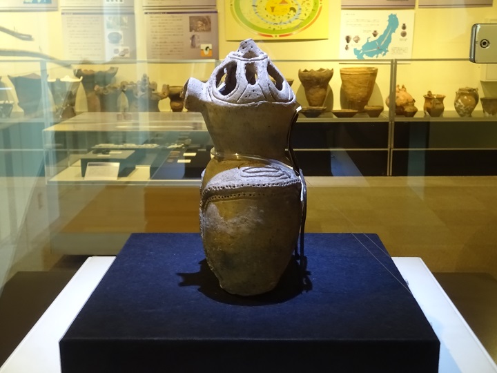 「異形」と表現される事が多い縄文土偶さんの中でも、ちゅうた君の造形のユニークさは際立っている。ガッシリとした両足の上に、直接お顔が乗ったように見える。目は穴で表現され、突起状のお口は上を向いており、私は初めて見たときに、まるで「ポット」のようだなと感じた。縄文人が果実酒でも作って、それを楽しむ際の器かな? なんて勝手に想像したのだ。