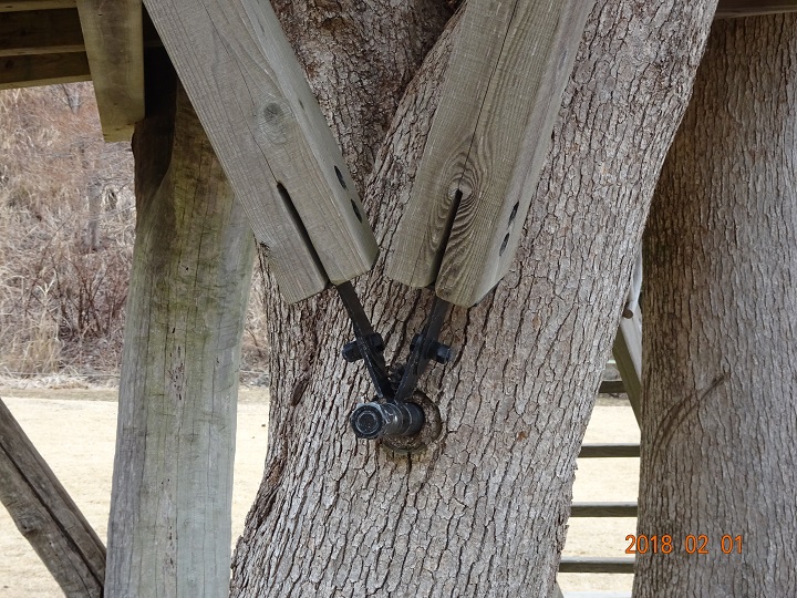 勿論、将来のツリーハウス建築に向けての構造・工法チェックも怠らない。常緑樹に打ち込んだアンカーがツリーハウスの荷重を支える仕組みに感心。こういう専門部材って特注なのだろうか??