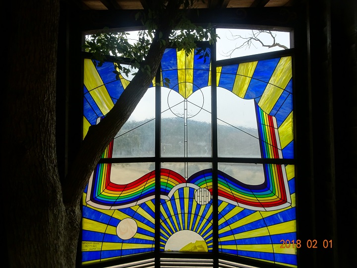 中の広さは私の予想の5割増し程度(広くてビックリした)。芝生広場を遠望するガラスは「ステンドグラス調」にペインティングされている。ここで読書したら最高だろうな!