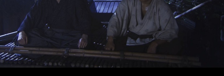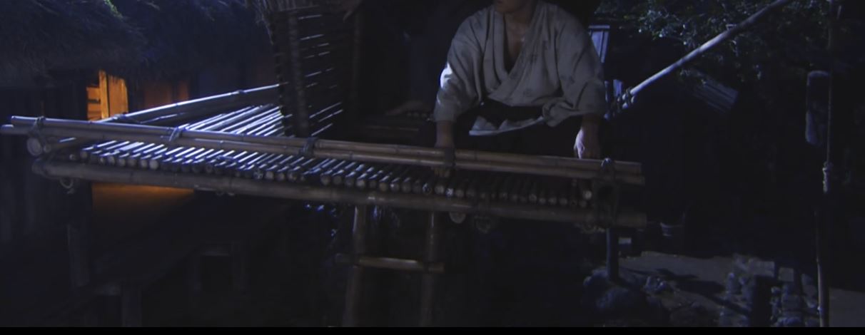 次なる登場シーンは放送開始から約15分後。西郷吉之助(隆盛)が江戸行きについて大久保正助(利通)と語り合う場面(夜)である。ここで初めて上部構造をハッキリと確認できた。部材はおそらく「竹」である。構造は床と低い手摺りのみで壁や屋根は無い。