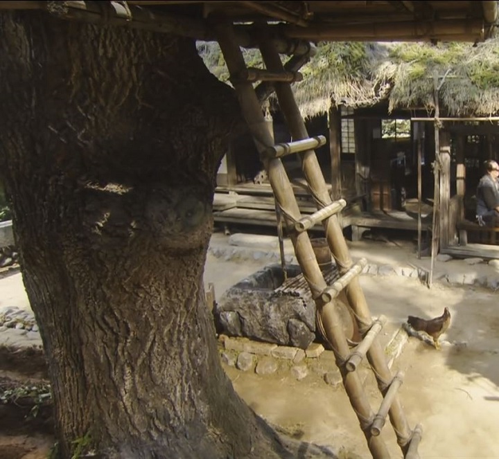 最後のシーンは放送開始から約34分後。吉之助と須賀、須賀の父の3名が登場する離縁の場面だ。ここでは、樹上の縁台の梯子が無い側の接合部が垣間見える。どうやら支柱となる樹木の周辺を枠で囲って、斜めに伸びた1本の枝らしきものが支え棒のような役割を果たしているように見える。構造としてはやはりシンプルだ。
