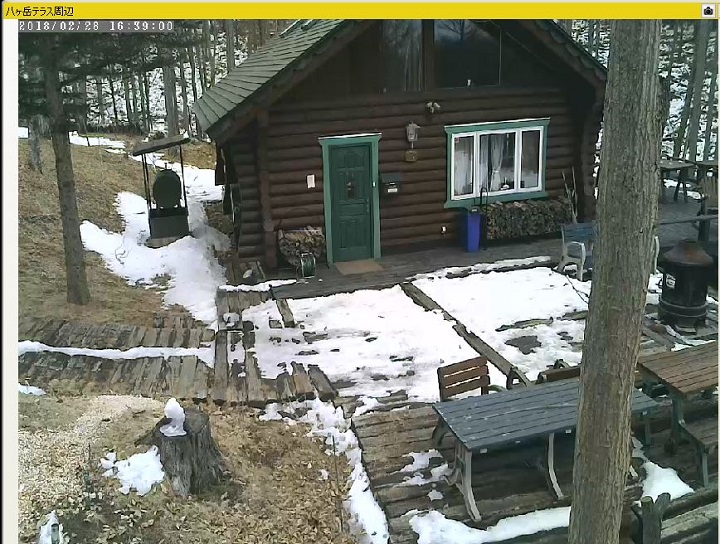 下掲1枚目の写真が、今朝7時20分の枕木テラスの様子。一面、雪に覆われている。そして2枚目が昨日の午後4時39分の様子。