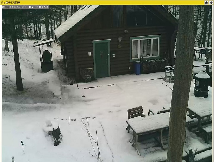 とは言っても、それなりの大風が吹いたのであるから敷地内の様子を確認する必要がある。順番がいつもと逆だが、デスクトップPCで「カメラ一発」を開いた。目に飛び込んできたのは意外な光景。「あっ、雪が積もっている!」