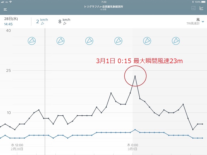 今日の場合、重要なのは「風向・風速計」のデータである。この機器は、八ヶ岳オフィスのウッドデッキ手摺りに設置(https://www.triglav.life/?page_id=18197)してあるので、オフィス周辺の風の状況を詳細に記録しているはずだ。そこで、昨日正午以降の風向と風速を示すグラフ画面を表示してみた。