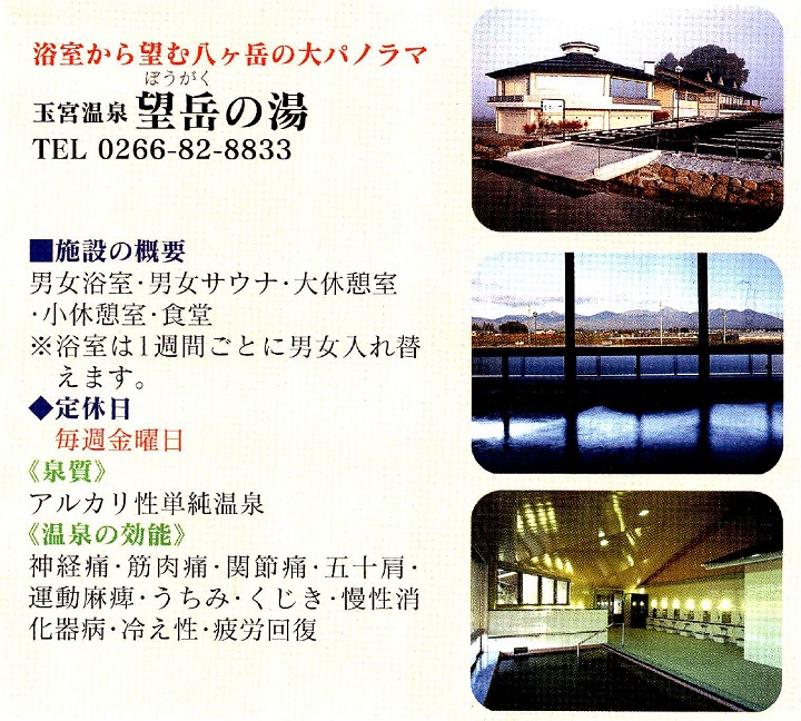 こんな日にわざわざ露天風呂に浸かりに行く程、私はもの好きではない。今日は「広い内湯」が売りの温泉を訪れるのが「大人の判断」だ。すぐに思い付いた温泉がひとつあった。茅野市の玉宮温泉『望岳の湯(http://www.city.chino.lg.jp/www/contents/1000000764000/)』である。