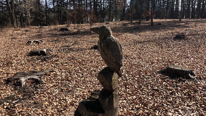 そして、もうひとつの魅力が、遺跡を埋め戻した場所に形成された『阿久の森』だ。中央道の脇に位置する「広葉樹林(雑木林)」であり、陽当たりが良好。本当に穏やかで、心安まるスペースである。森の中では、様々な種類の動物や鳥の彫刻が、散策者を出迎えてくれる。これらは、立木をそのまま彫刻した物(チェンソーアート?)であろう。周辺の樹木に違和感なく溶け込んでおり、思わず、撫でたり、話しかけてみたくなる。