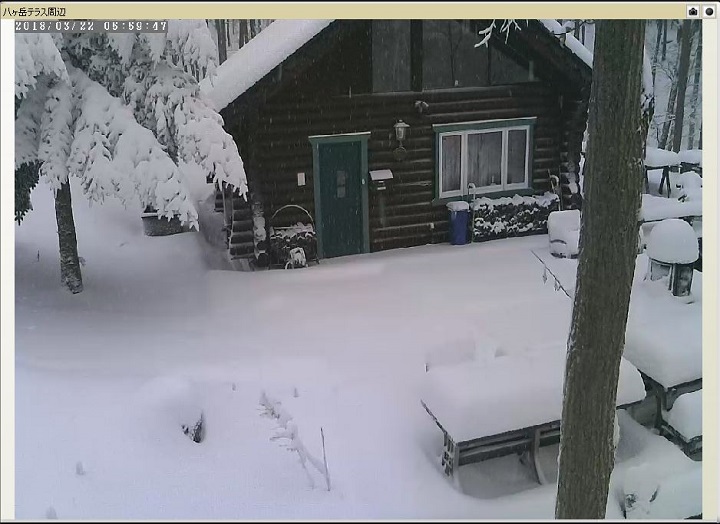 そこには「雪深く埋もれた」八ヶ岳オフィス周辺の状況が映し出された。積雪量は30cm近そうだ。この冬一番の積雪量となった事は間違いない!