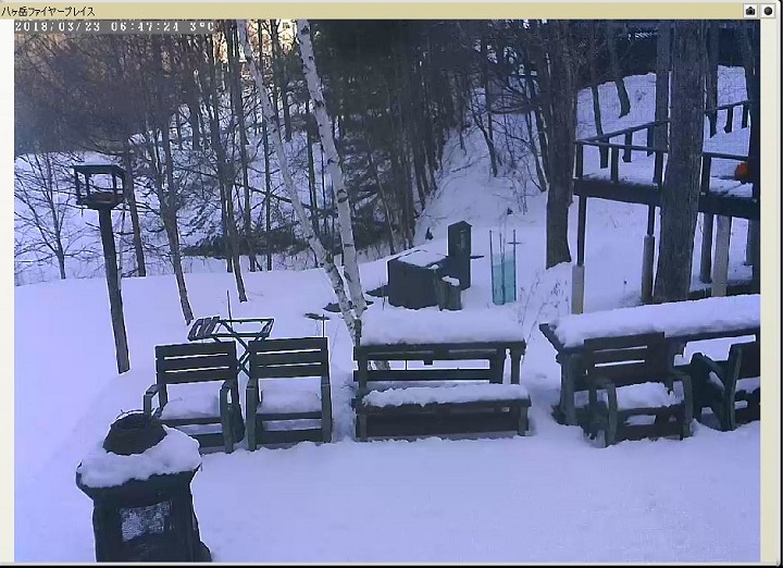上の写真は、今朝午前7時前の「枕木テラス」と「オフィスウッドデッキ」の状況である。1日で雪解けが半分程進んだイメージだが、まだ一面が雪で覆われている状況に変わりはない。
