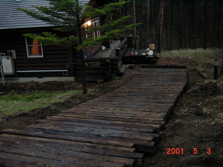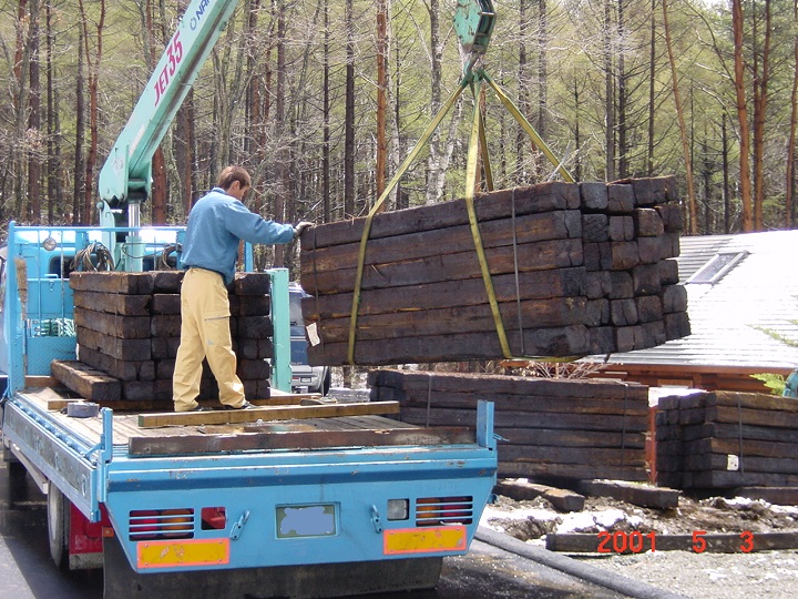 2001年5月3日の午前11時過ぎに、最後の輸入枕木が配送された。敷地内に山積みになっていく枕木(計350本)に運送業者さんはビックリしたようで「造園業を始めるんですか?」と聞かれた。