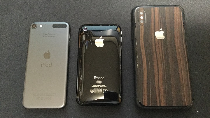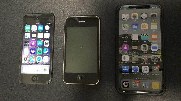 試しに、現在の愛機である iPhone X と iPod touch(第6世代)と並べてみた。3Gsの小ささに驚く。