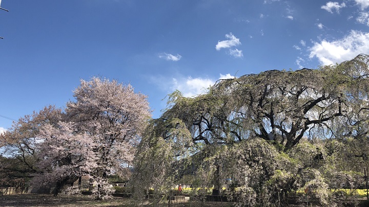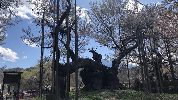樹種は「エドヒガン」の変種、樹齢は推定「400年」、山梨県の天然記念物に指定される名木だ。私はこの桜の「艶っぽさ」が好きで、開花期に八ヶ岳に滞在した際には、ふらっとお花見に訪れる。