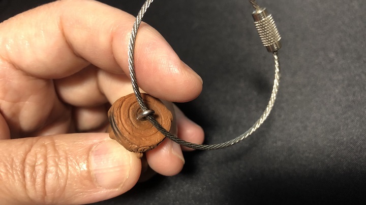 5種類の国宝土偶さんのガチャガチャの内、キーホルダー風に加工して、見映えや安定性が良いのは、「縄文のビーナスさま」と「仮面の女神さま」という尖石コンビである。だが、「仮面の女神さま」はサイズ的に1回り大きく、鞄等にぶら下げるにはちょっと目立ちすぎる。金具を取り付ける頭頂部の形状の安定性も「縄文のビーナスさま」が勝っている。
