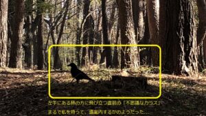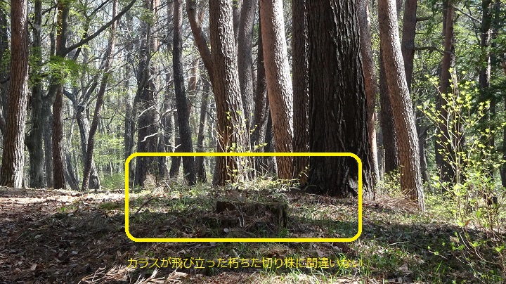 幸い、カラスが林の方向へ飛び去る直前の写真を目印となる朽ちた切り株と一緒に1枚撮影してあった。