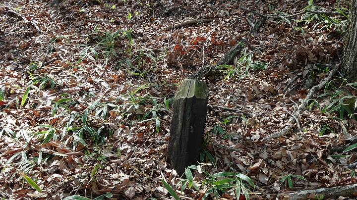 切り株は散歩コースの右脇にあったので、逆順路で歩いた場合、左側を気にすればよい。注意深く様子を見ながら歩いて行くと、進行方向前方の左手に「謎の構造物」を発見した。最初はシルエットの感じで、ポストかなと思ったのだが、こんな山中にそんなモノ有るわけないし、色も赤くはない。