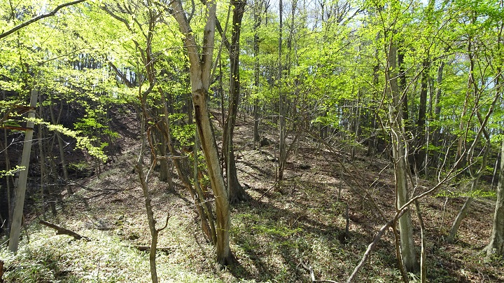 この枕木の加工物の右手は急な下りの傾斜となっていた。昨日歩いた順路であれば左手側に相当し、あのカラスが飛び去ったのと同じ方向である。