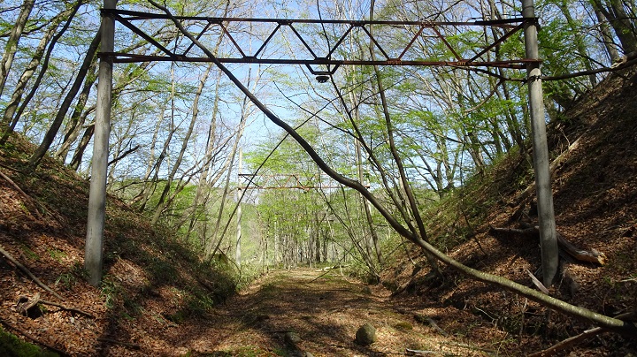 確かに傾斜は急だが、まったくの未整備という感じではない。むしろ、人が繰り返し通ったような気配がある。それを頼りに急傾斜を慎重に下りていくと、右手に電信柱のような物が見えてきた。さらに近付くと鉄道の「架線柱」だった。この時点で、道のように見えたのは「旧中央本線」の線路跡である事に気が付いた。
