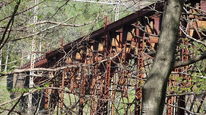 さらに勇気を振り絞って、フェンスの左手下方からズームアップして橋梁部分を写真撮影。赤錆の浮いた構造物特有の「朽ちたもの悲しさ」が伝わってきた。